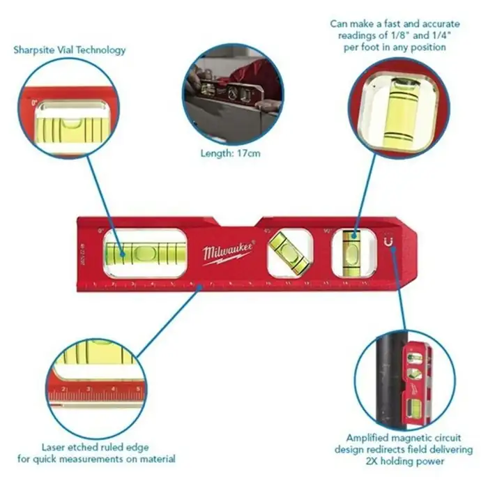 تراز مغناطیسی میلواکی مدل 4932459097 یک ابزار حرفهای و دقیق برای اندازهگیری تراز در کارهای ساختمانی، صنعتی و تأسیساتی است. این محصول دارای بدنهی آلومینیومی یکتکه (Billet) با آهنربای قدرتمند Rare Earth است که چسبندگی بالایی به سطوح فلزی ایجاد میکند و دقت اندازهگیری را افزایش میدهد.